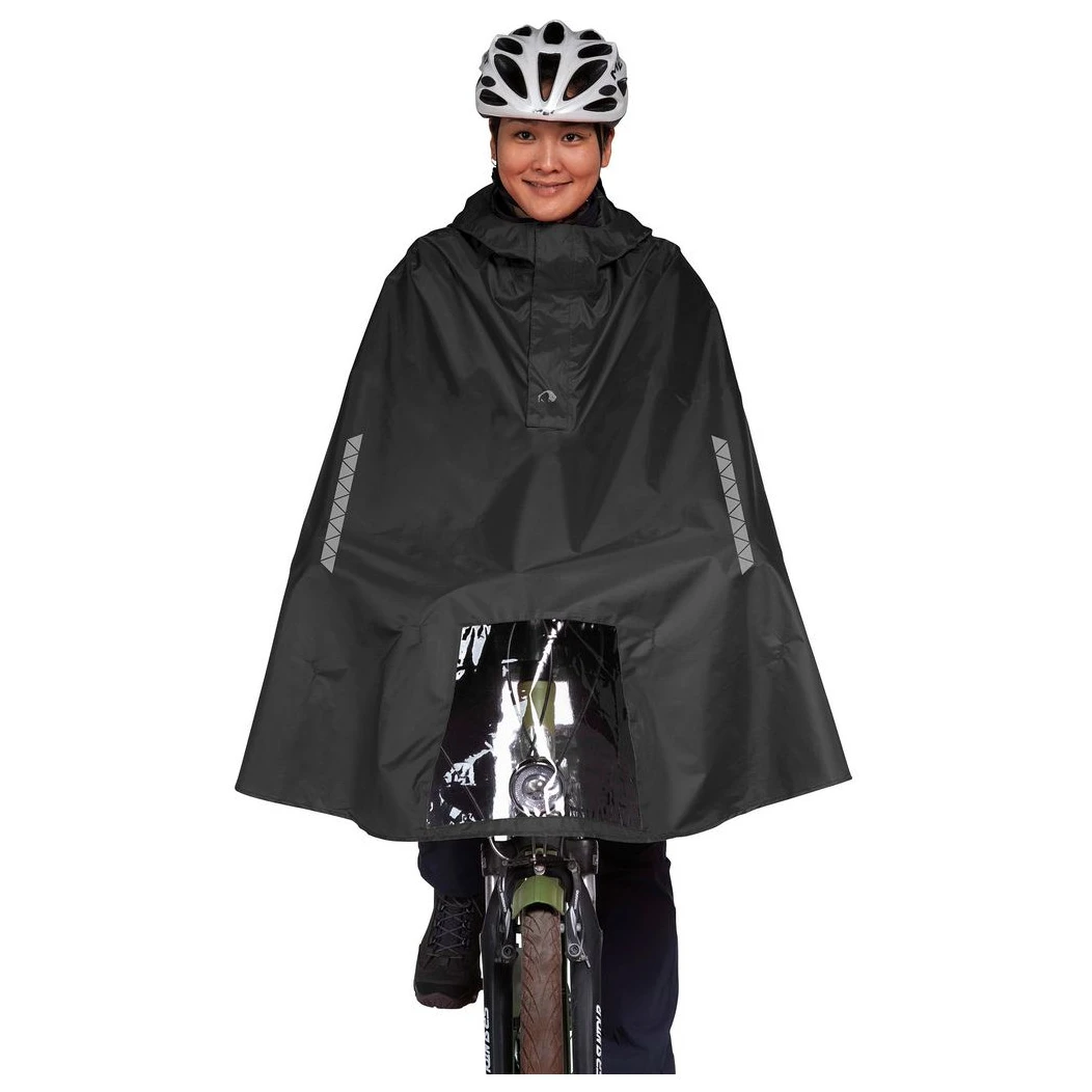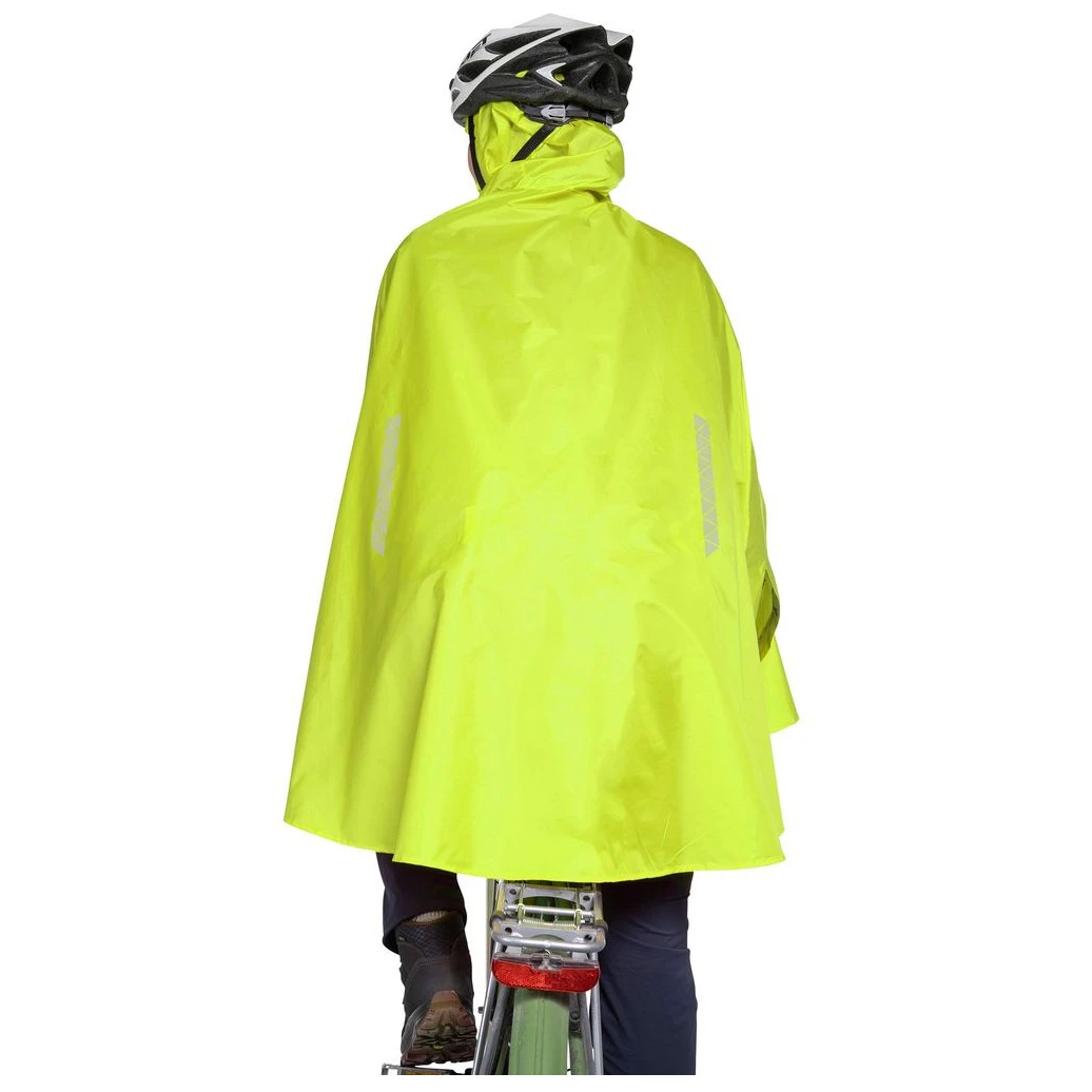 El poncho tiene una capucha con cordón que se puede usar debajo o sobre un casco de bicicleta. Gracias a la cintura elástica, se mantiene firme incluso cuando se conduce contra el viento, y dos presillas para los pulgares aseguran que el poncho permanezca en su lugar. Para mayor comodidad, hay aberturas laterales para facilitar el movimiento de las manos.