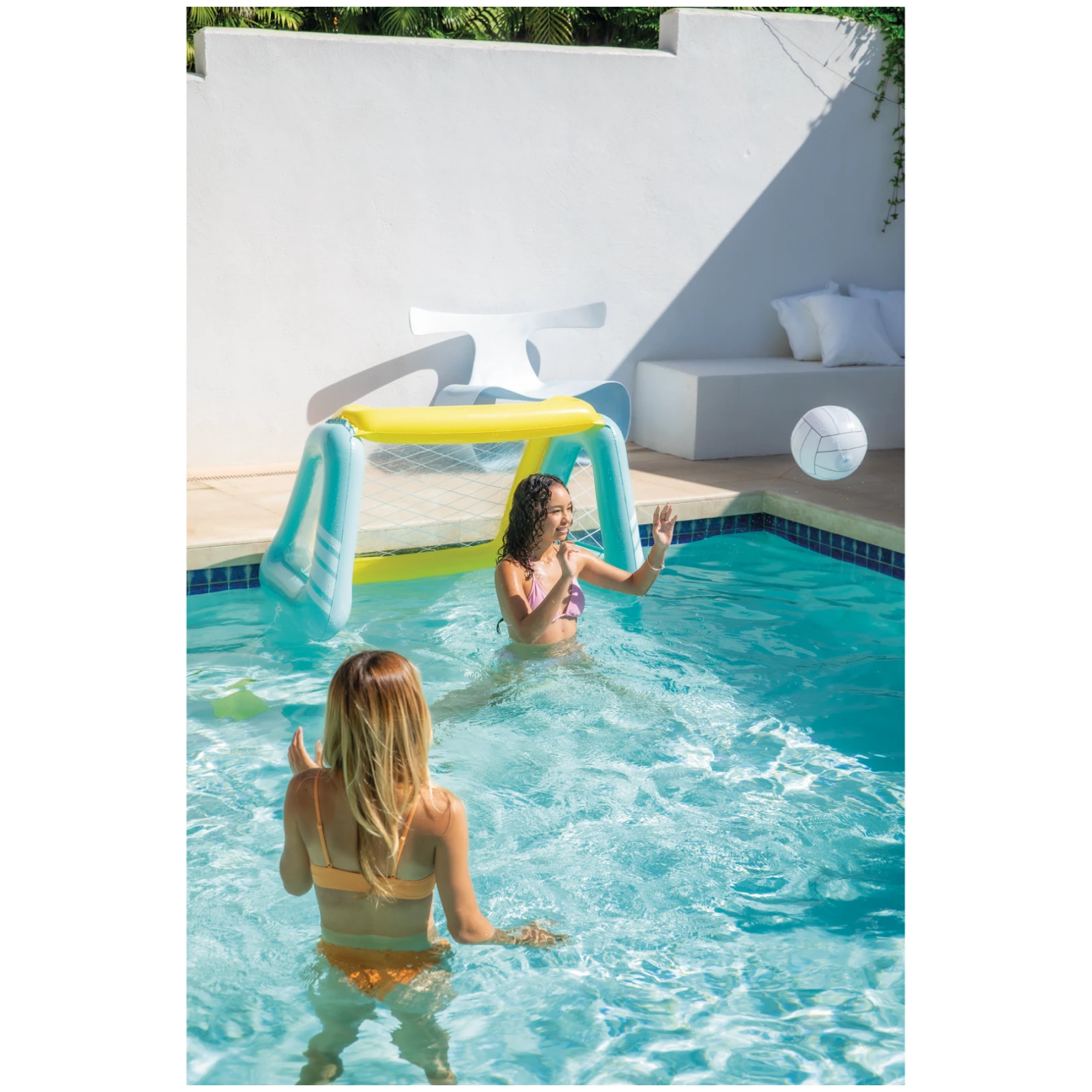 Otro de una serie de juguetes populares de la marca probada Intex, apto tanto para la piscina como para el jardín. Se trata de una portería hinchable con balón Fun Goals Game.
