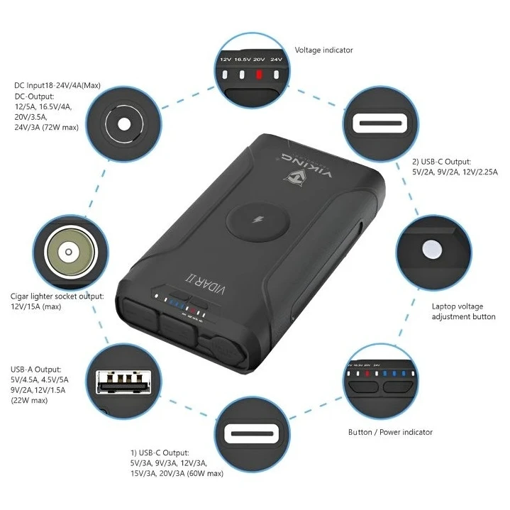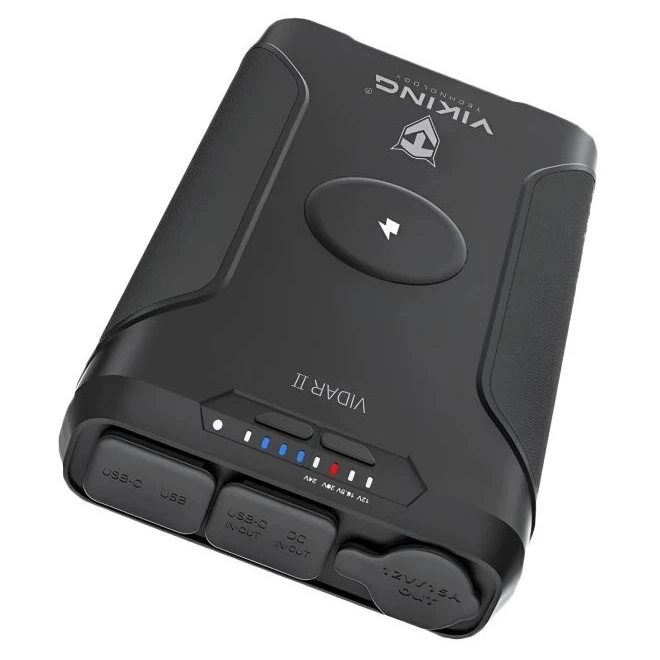 La powerbank para exteriores VIDAR II de Viking Technology es una powerbank práctica y duradera que combina alta capacidad, rendimiento y versátiles opciones de conexión. Su robusta construcción, la luz LED integrada y la amplia gama de puertos la convierten en la compañera ideal para acampar, trabajar en exteriores y para el uso diario.