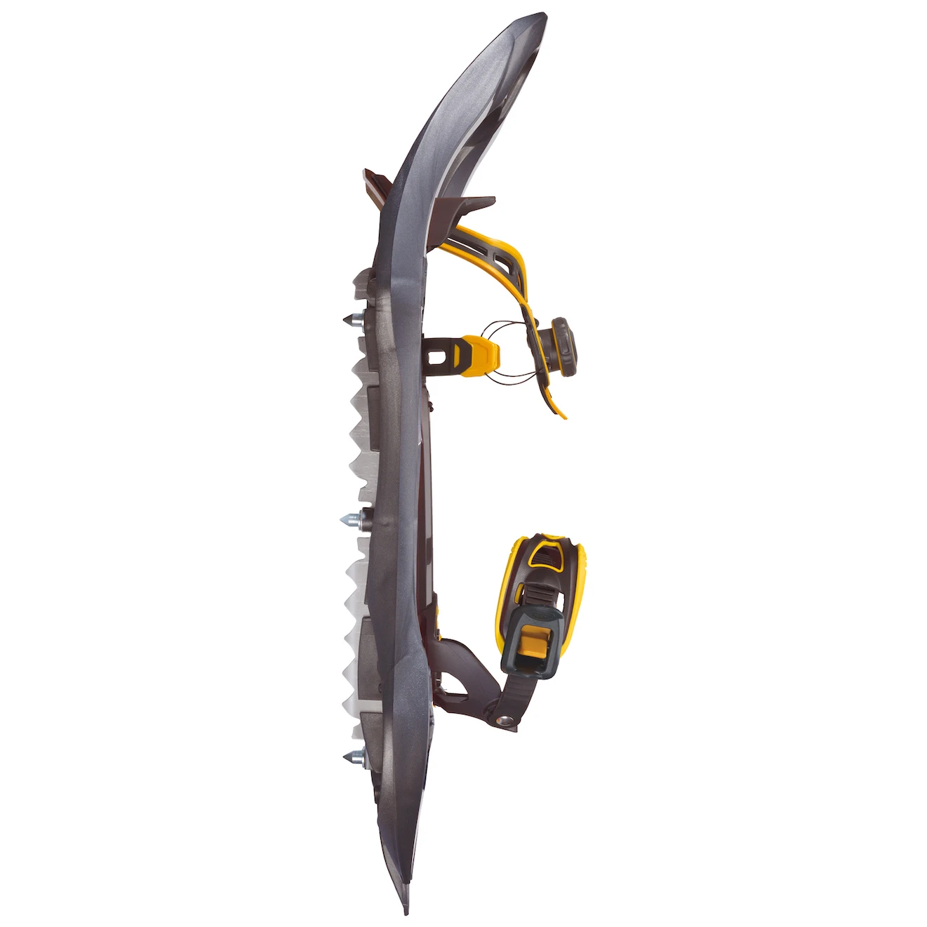 La forma de las raquetas de nieve se asemeja a un reloj de arena. Gracias a ello, se asientan perfectamente una al lado de la otra al caminar y no interfieren entre sí. El diseño 3D del armazón garantiza un contacto ideal con la superficie sobre cualquier tipo de nieve. Los dientes laterales y las 8 púas de acero intercambiables trabajan en terrenos muy helados. Hay un diente de acero macizo en la parte delantera. En superficies más blandas, también entran en juego las molduras transversales del bastidor. En nieve polvo fresca, el peso se distribuye por todo el armazón de la raqueta y no te haces daño.