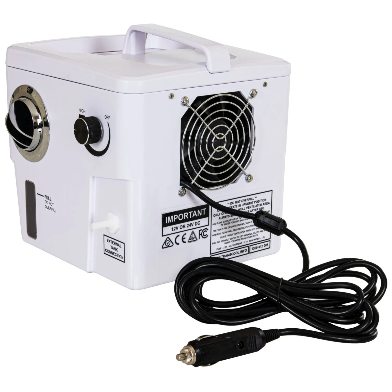 El nuevo sistema dual de circuitos de voltaje, tecnológicamente avanzado, ahora permite utilizar el enfriador evaporativo portátil Transcool en el hogar tanto con un voltaje de 12V como Corriente continua de 24 V con una tensión de corriente alterna de 100-240 V mediante un transformador de 100-240 V. La unidad EC3 está equipada con un mecanismo de control de la velocidad del ventilador que permite una gama completa de todas las velocidades, desde APAGADO hasta ALTO. También está equipada con la tecnología de corte por baja tensión de la batería, que reduce el riesgo de que las baterías se descarguen. La unidad se ha desarrollado y fabricado en Australia y utiliza componentes locales e importados. Es ligero, compacto, robusto, consume poca corriente y puede utilizarse con agua o hielo.
