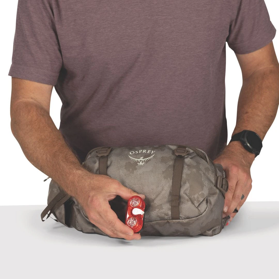 Las correas de compresión laterales aseguran el contenido en el interior, reducen el tamaño de la riñonera y permiten colocar una chaqueta liviana o una sudadera. Por supuesto, hay elementos reflectantes y un lazo para colocar una luz intermitente (no incluido en el paquete).