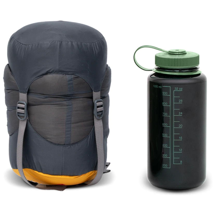 El saco de dormir también cuenta con un cordón elástico ajustable en la cintura para proporcionar aislamiento adicional cuando estás sentado en el saco de dormir y lazos para colgarlo. Los materiales no contienen PFAS y, en el caso del plumón, cumplen con la certificación Responsible Down Standart, que garantiza buenas condiciones en la cría de animales.