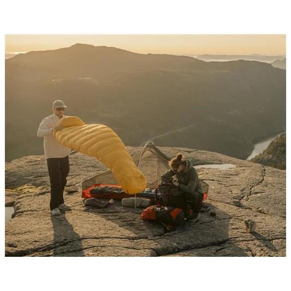 Está relleno de plumas de plumón de pato con un relleno de 700 cuin y una proporción de plumón de 95/5, que aísla perfectamente. A ello contribuye el cuello térmico de nueva forma, que envuelve firmemente los hombros y evita la pérdida de calor. La capucha tiene cordones a ambos lados. La cómoda forma de momia 3D mejora el aislamiento térmico y proporciona comodidad. La zona que rodea los pies tiene forma especial de aleta de tiburón, lo que permite que los pies permanezcan estirados en su posición natural durante la noche.