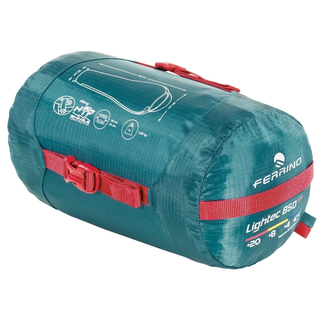 Saco de dormir Lightec SM 850 de la marca Ferrino será un compañero fiable para caminatas más largas en verano y primavera. Combina buenas propiedades térmicas y ligereza, lo que agradecerás especialmente cuando practiques senderismo en terrenos duros. El relleno consiste en finas fibras huecas H. T. F.Compact®, que presentan una excelente plegabilidad y un peso reducido.