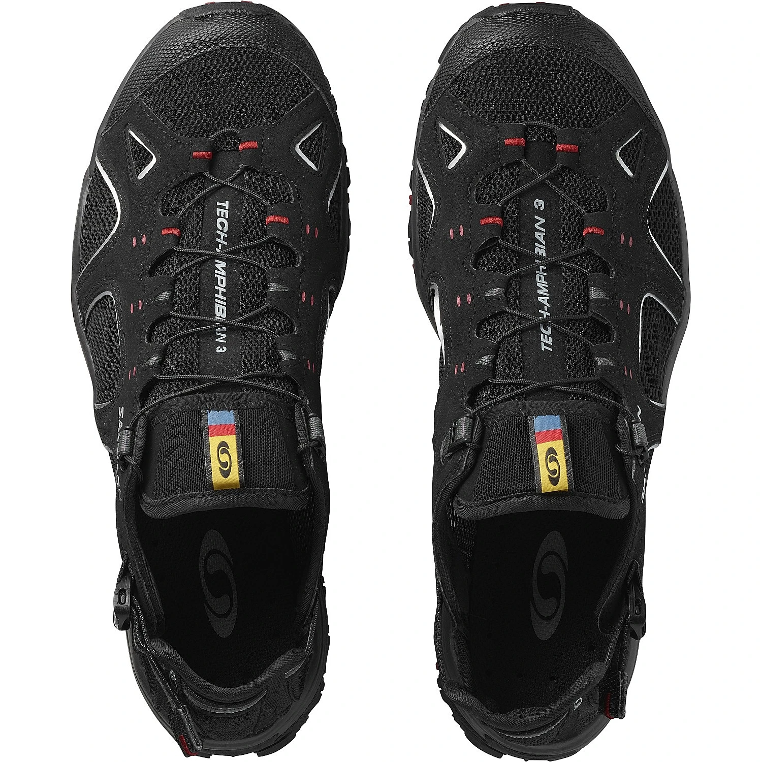 Salomon Techamphibian 3 son sandalias para hombre adecuadas para caminar en agua y tierra. Gracias a la suela estampada con tecnología High Traction Contagrip®, podrás manejarte en superficies húmedas y secas, blandas y duras. La espuma EVA preformada de la entresuela proporciona la máxima amortiguación y sujeción anatómica al pie. La plantilla extraíble es de espuma EVA troquelada. La puntera cerrada proporciona protección a los dedos y el sistema Sensifit™ garantiza un ajuste preciso alrededor del pie. Los cordones Quicklace™ facilitan y agilizan el atado y desatado de los cordones. La zapatilla también cuenta con orificios que absorben la humedad y malla Anti-Debris, que evita que la suciedad y las piedrecitas se introduzcan en el interior de la zapatilla. Los zapatos también cuentan con una correa ajustable en el talón y un bolsillo para cordones. Las sandalias también se pueden convertir fácilmente en zapatillas gracias al tacón deslizante.
