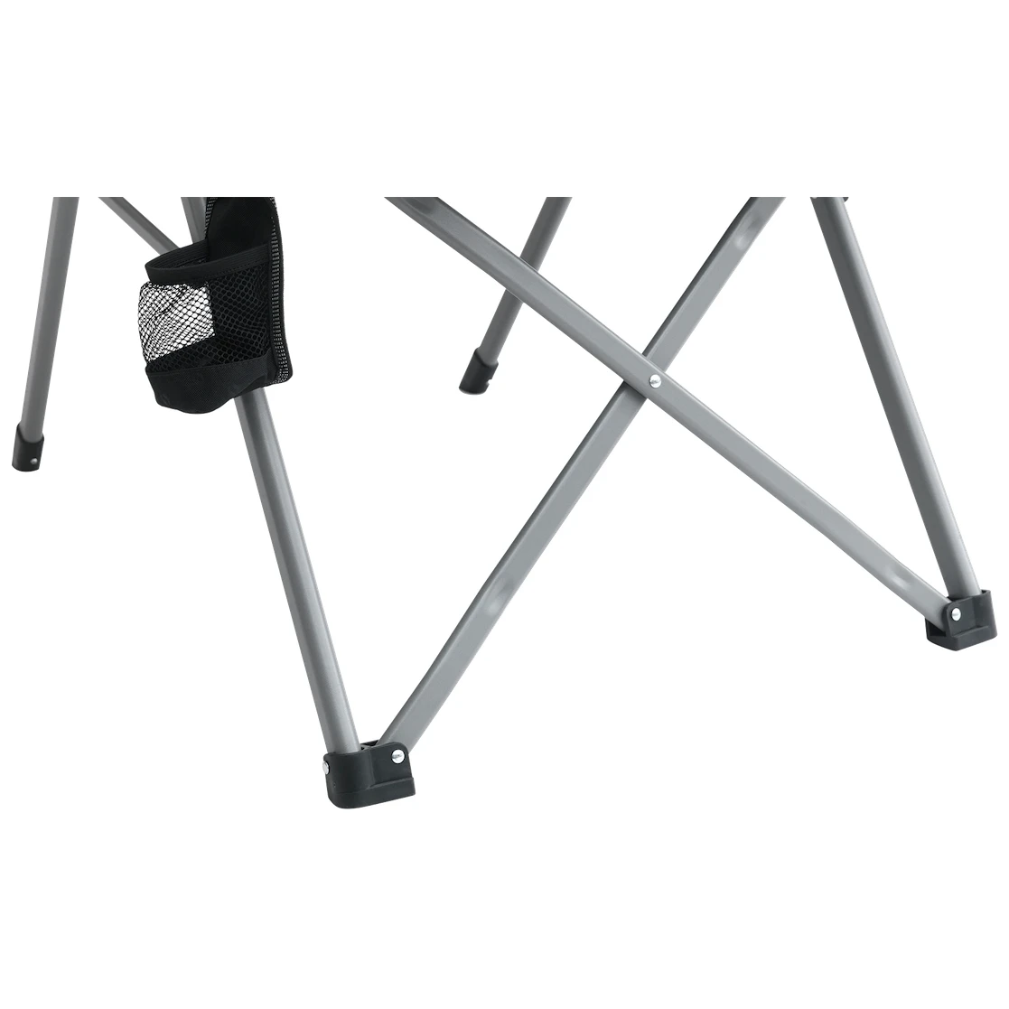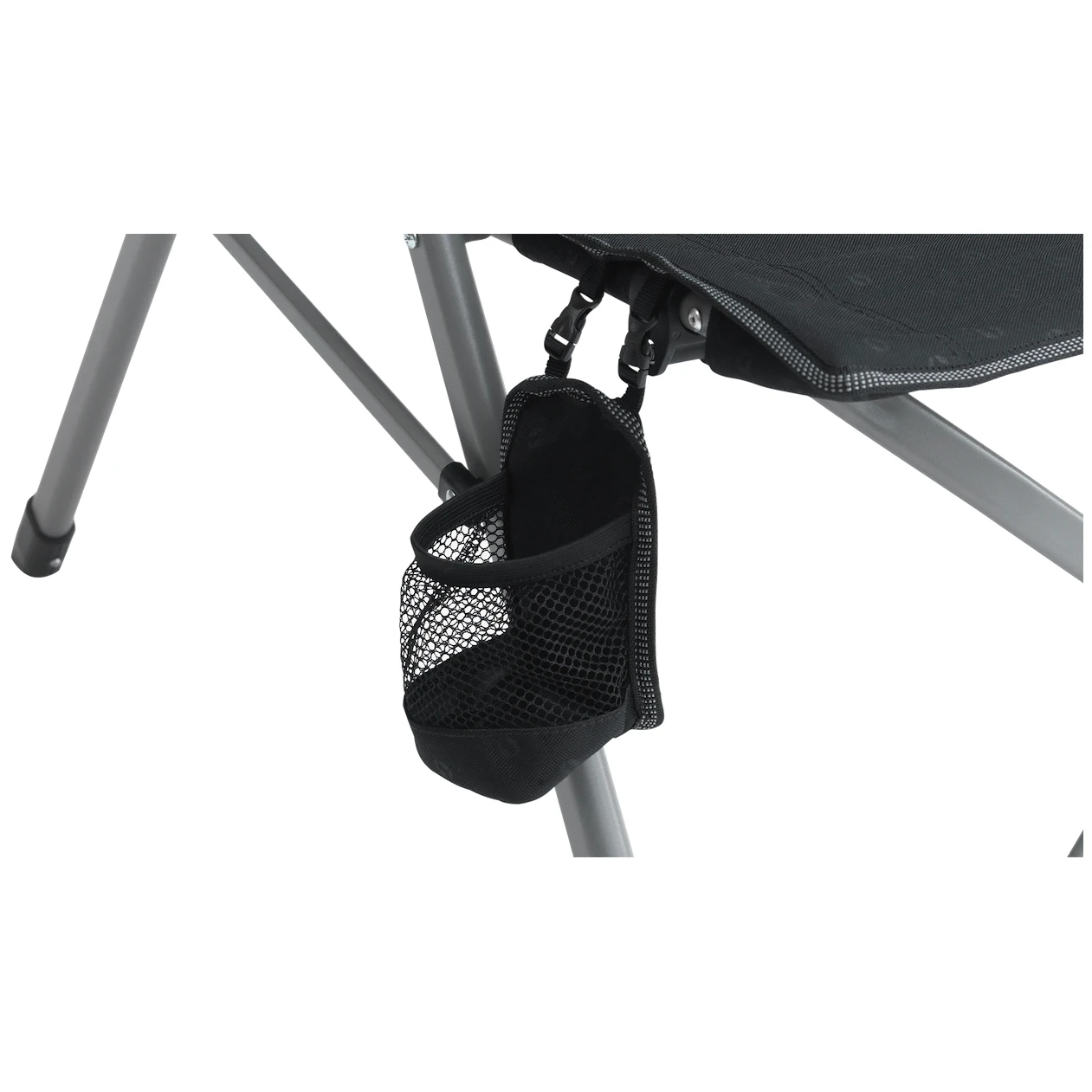 La resistente funda de poliéster de la silla se complementa con una construcción ligera de acero de calidad con cerradura para mayor seguridad. Esta es una garantía de durabilidad. La parte inferior tiene una mayor superficie, lo que garantiza la estabilidad incluso en terrenos más blandos, por ejemplo cerca del agua. La silla tiene reposabrazos anchos y buen soporte para la espalda, que se puede ajustar en una de las tres posiciones. En el lateral encontrará un portabebidas extraíble.