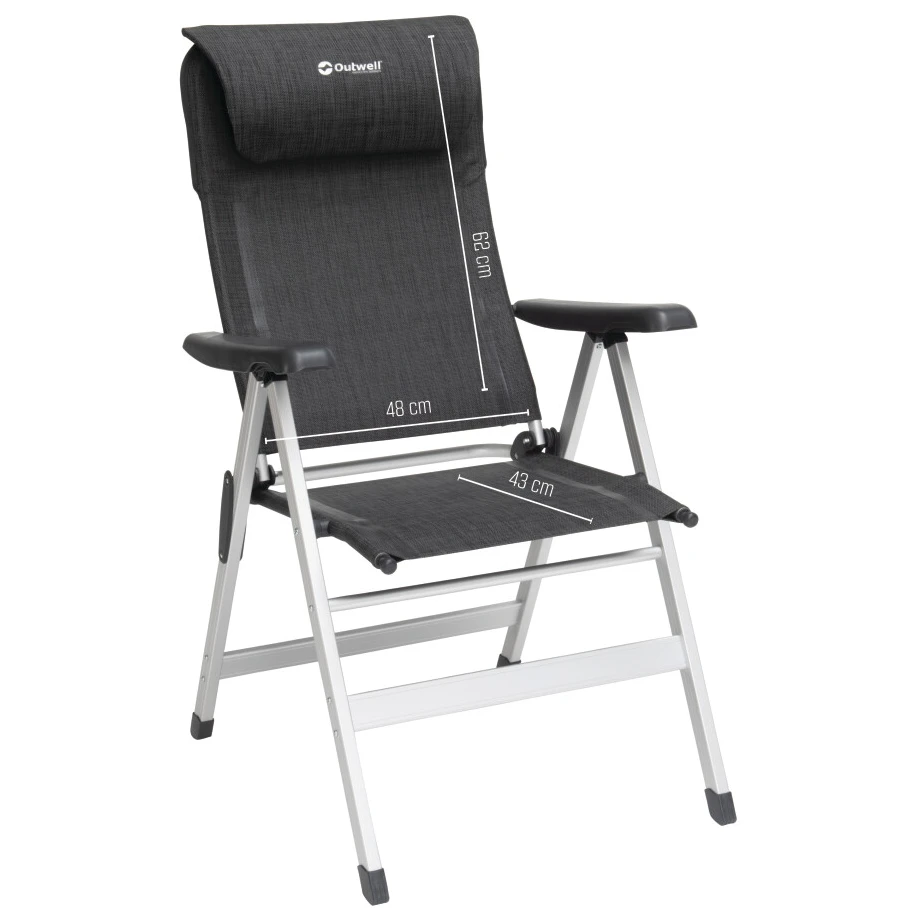 Silla de camping Milton del reconocido fabricante danés Outwell es una silla de alta calidad, muy cómoda y con un estilo discreto que satisfará las necesidades de los usuarios más exigentes. Para montarla y desmontarla no es necesario complicarse. La silla tiene una estructura de aluminio ligera pero duradera con una capacidad de carga de 125 kg y una funda de poliéster tejido con revestimiento. El respaldo puede ajustarse en 7 niveles diferentes y el reposacabezas también es ajustable y extraíble. Además de la variabilidad de posiciones, los reposabrazos ergonómicos garantizan la calidad del asiento. Para un confort aún mayor, puede combinarse con el reposapiés Dauphin.