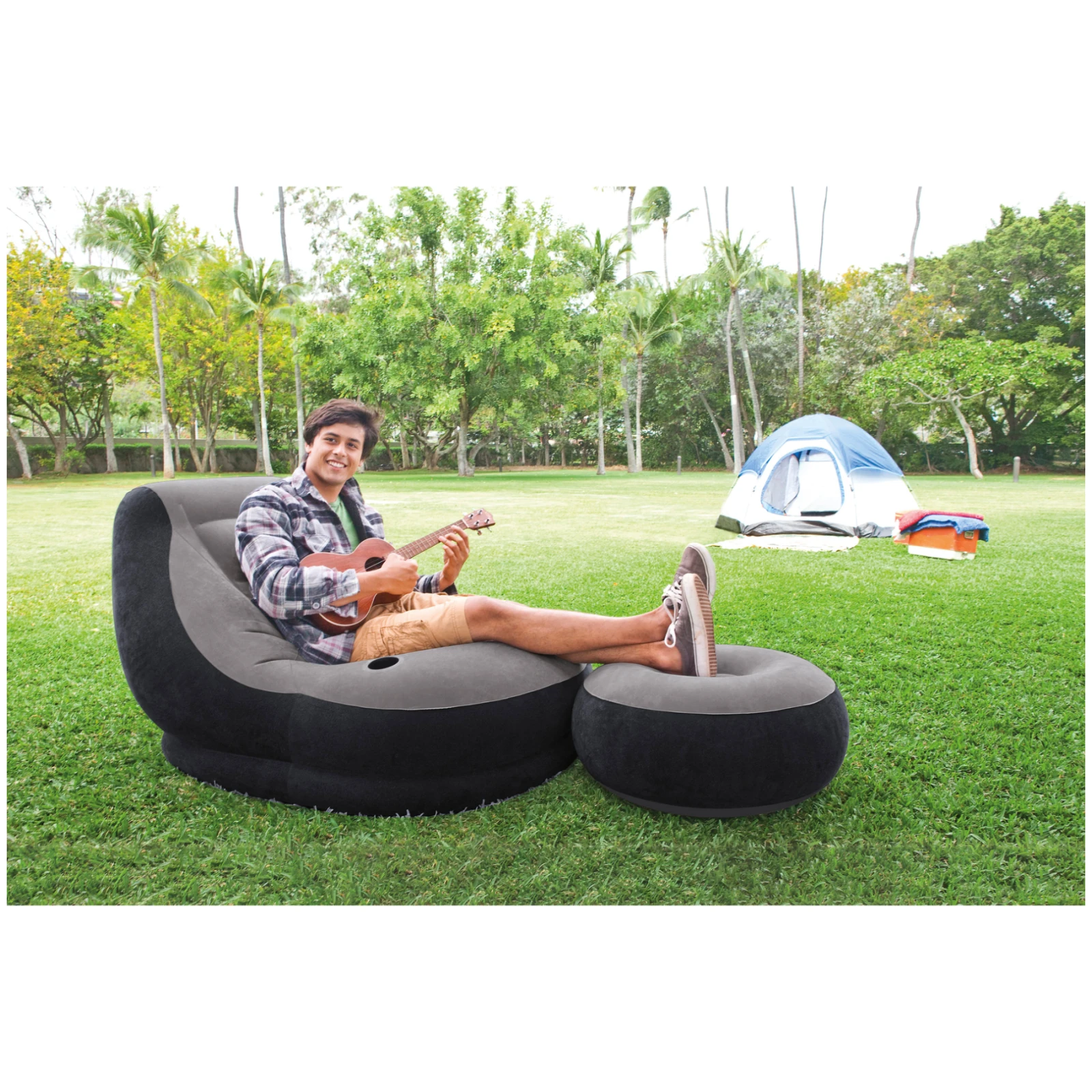 Intex Ultra Lounge es un sillón inflable con reposapiés y portavasos para un descanso cómodo en casa o de viaje.