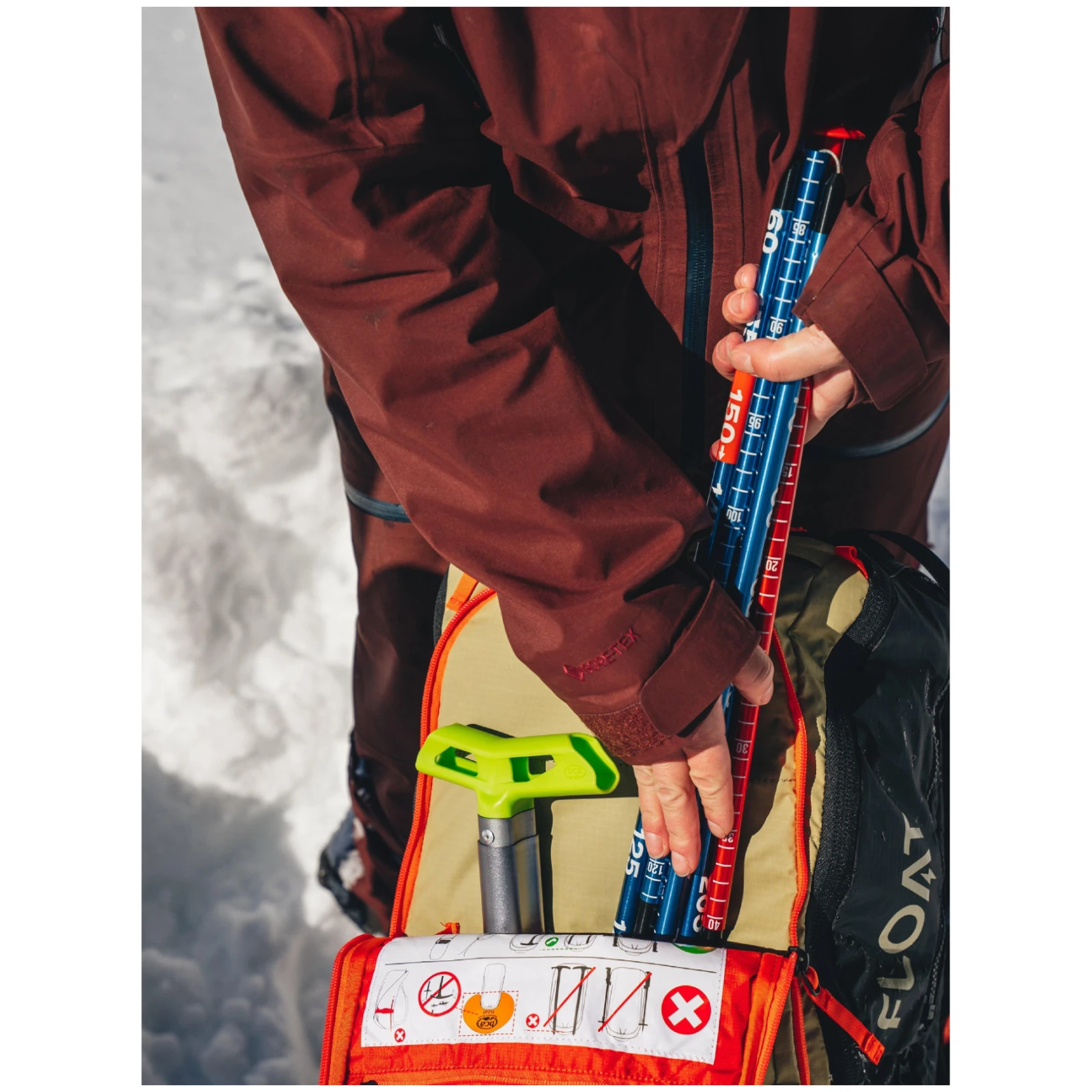 Las escalas de profundidad en la sonda son dobles: en un lado cada 5 cm y en el otro cada 1 cm, lo que permite una medición precisa del enterramiento y la estructura del perfil de nieve. Los segmentos de la sonda se encajan entre sí (juntas cónicas), lo que permite un plegado compacto y un embalaje eficiente en la mochila.