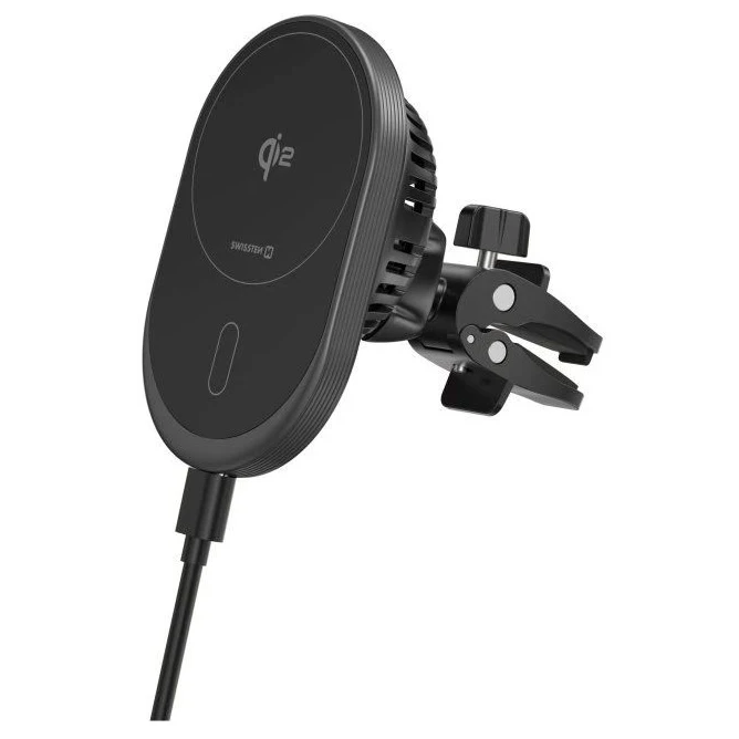 Swissten MagRide es un soporte de coche moderno con carga inalámbrica Qi2 de hasta 15 W, que carga de forma segura iPhones, Samsung y otros teléfonos compatibles.