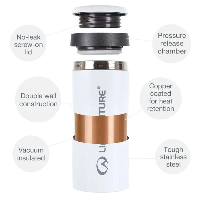 La construcción de doble pared está mejorada con una capa de cobre que garantiza unas propiedades de aislamiento aún mejores. Así, tu bebida se mantendrá caliente o fría durante más tiempo. La tapa se puede desmontar por completo para una limpieza perfecta e higiénica.