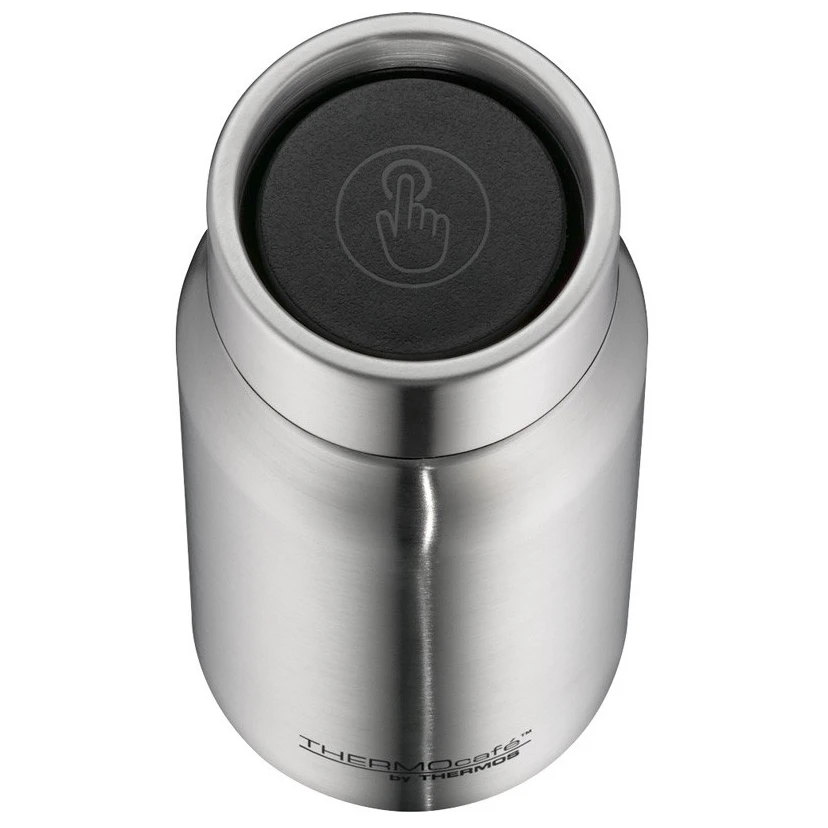 El termo está equipado con un cierre de botón práctico que permite abrirlo y cerrarlo con una mano. Cuando está cerrado, el termo es estanco, por lo que no tiene que preocuparse por derrames accidentales del contenido. El diseño especial del cierre permite beber por todo el borde de la tapa, lo que apreciará especialmente en situaciones en las que necesite concentrarse y beber con una mano.