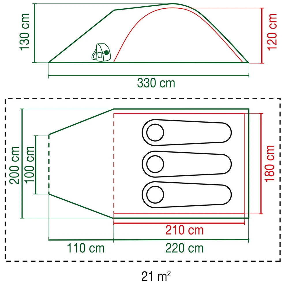 Todas las tiendas de la serie de modelos Kobuk Valley comparten características comunes, una sencilla construcción de tres vanos, un vestíbulo luminoso con ventanas y suelo elevado y, por último, pero no por ello menos importante, un dormitorio oscurecido con la tecnología patentada BlackOut Bedroom®. Coleman Kobuk Valley 3 Plus ofrece alojamiento para hasta tres personas en un dormitorio con una superficie de 210 x 180 cm. El vestíbulo puede utilizarse para guardar mochilas.