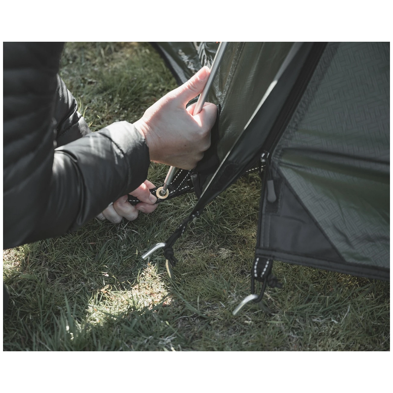 La tienda tiene un pequeño vestíbulo sin suelo, que ofrece espacio para guardar cosas. En el interior encontrarás un gancho que puede utilizarse para colgar equipamiento como un casco de bicicleta y un tendedero. Hay un bolsillo de malla en el dormitorio para pequeños objetos que quieras tener a mano.
