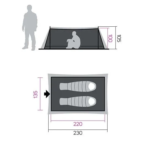 El material del forro es nailon 40D 260T; PU 7000 mm. La tienda tiene una entrada y un dormitorio. Por supuesto, las puertas están totalmente ventiladas. Fácil de guardar en el bolsillo, cremalleras YKK, pasadores de aluminio, hebillas y clips ITW. Fácil y rápido de construir, utilizando dos bastones de trekking. La tienda se puede utilizar sola o en combinación con un dosel ligero Hannah Skyline 2 light, con el que estarás protegido del viento y la lluvia.