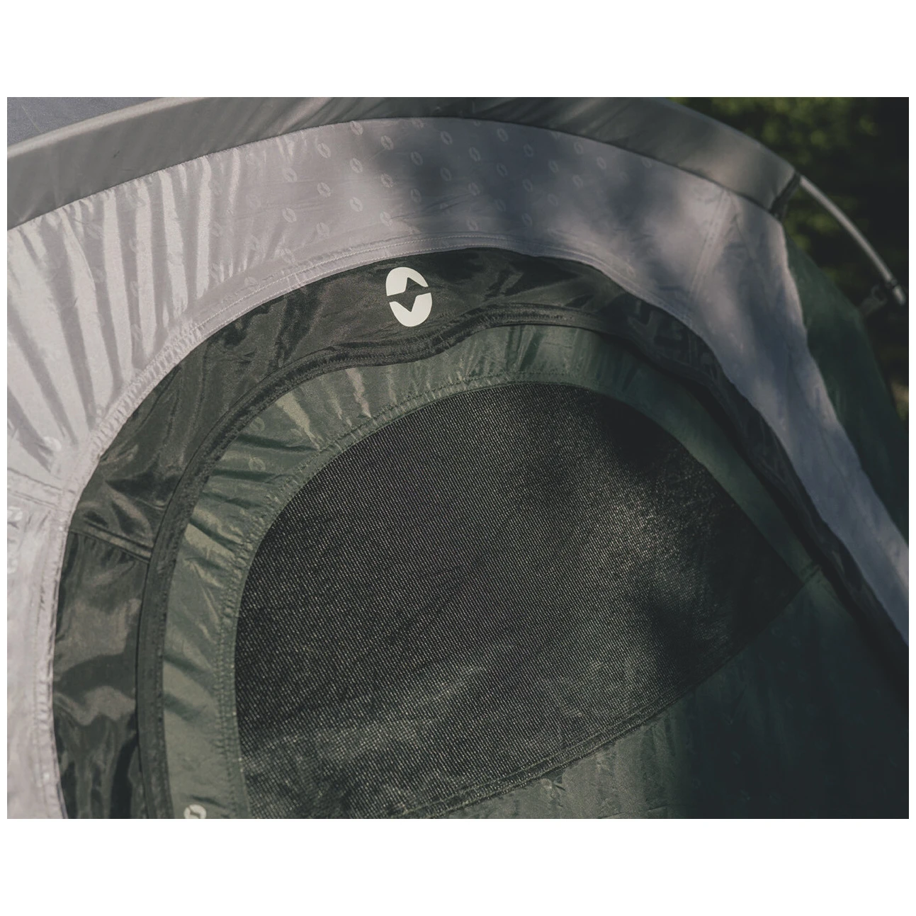 La estructura de la tienda está hecha de fibra de vidrio resistente pero flexible, que es ligera. La construcción de la tienda es muy sencilla gracias a la tecnología Duratec Pole System. Se doblan las barras exteriores, se pasan por el trópico y luego simplemente se cuelga el dormitorio dentro. A continuación, se clavan los pasadores y se fijan los cordones, que tienen puntos de sujeción dobles a lo largo del tejido y refuerzos especiales en los puntos de conexión con la tienda. Outwell El sistema Wind Guard 2.0 mejora la estabilidad en vientos fuertes.