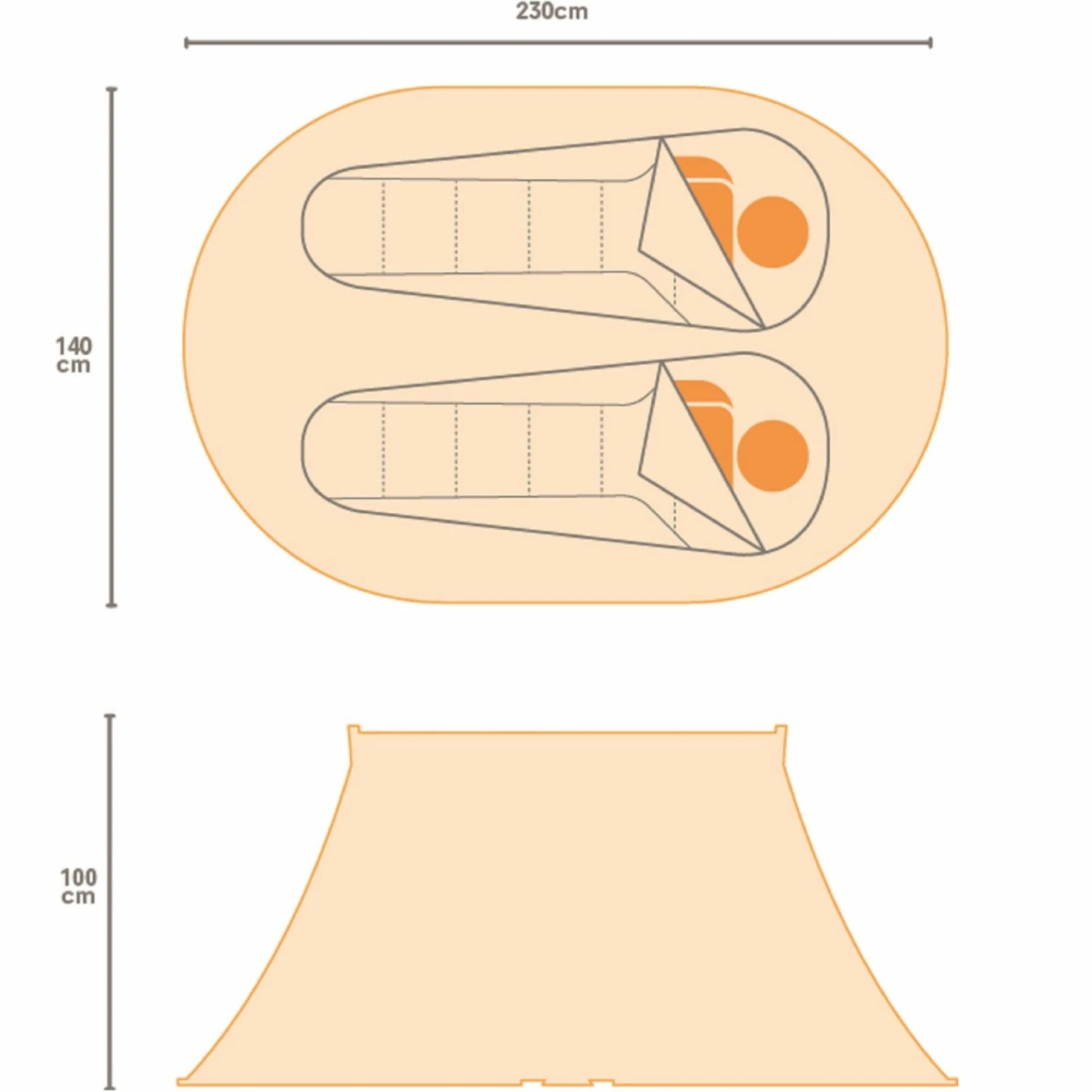 Cubretecho = la parte superior de una tienda de doble techo. Caracterizado por la columna de agua = capacidad del material para resistir la presión del agua. Indicada en milímetros.