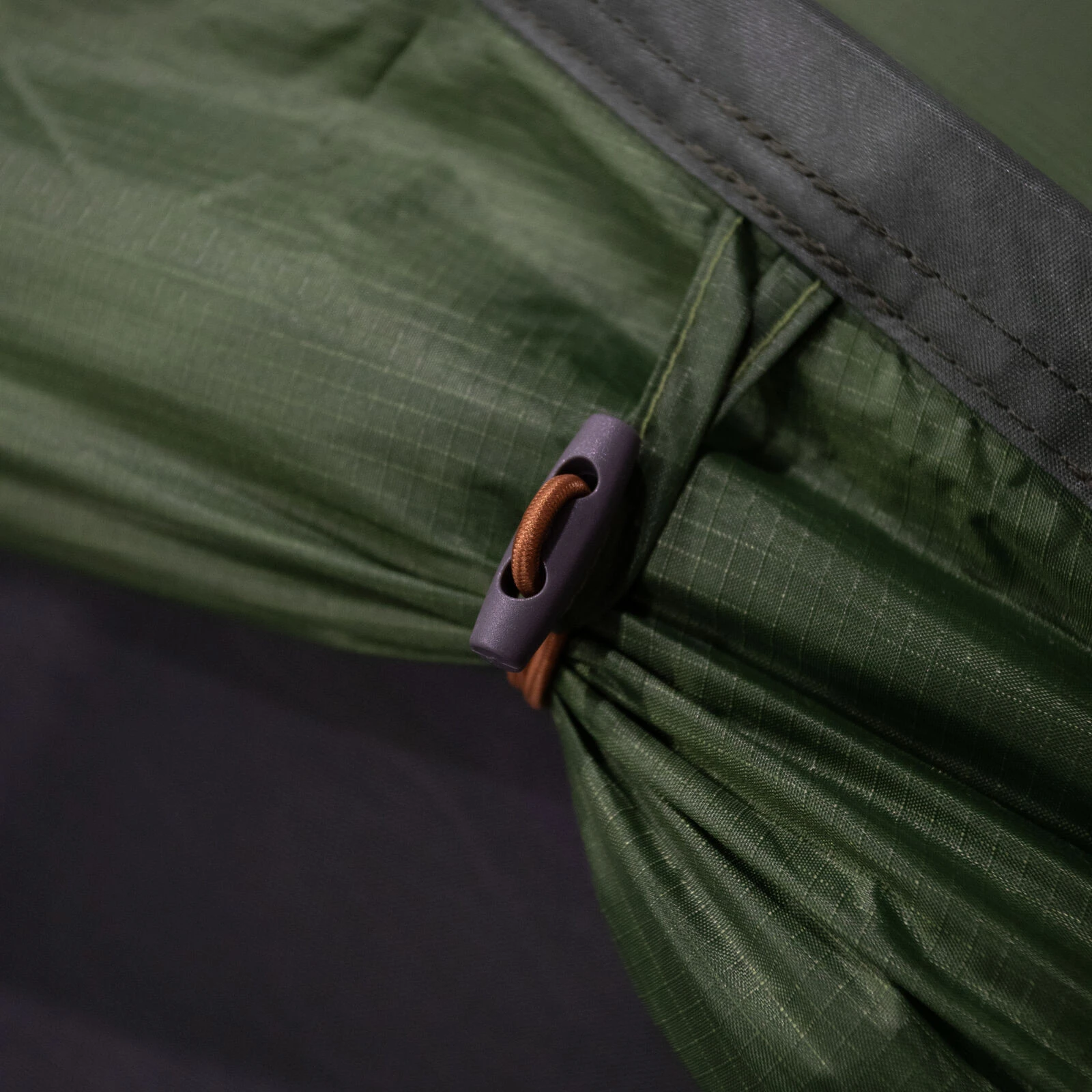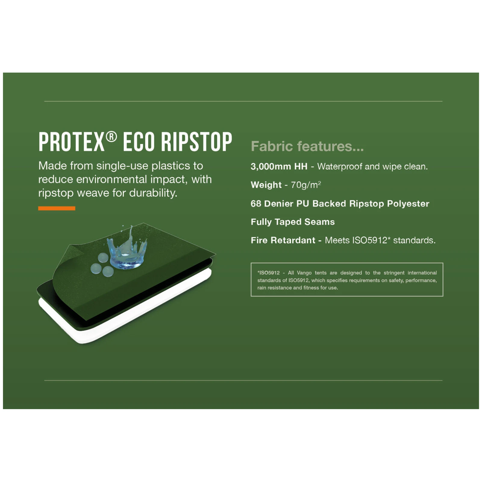 El tejido exterior Protex Eco Ripstop de poliéster resistente ofrece una impermeabilidad de 3.000 mm HH y costuras totalmente selladas, lo que garantiza una protección fiable contra la lluvia. El suelo de poliéster 70D PU con una columna de agua de 6.000 mm HH es resistente, fácil de limpiar y, gracias a su construcción tipo bañera, protege el interior de la tienda incluso en condiciones climáticas adversas.