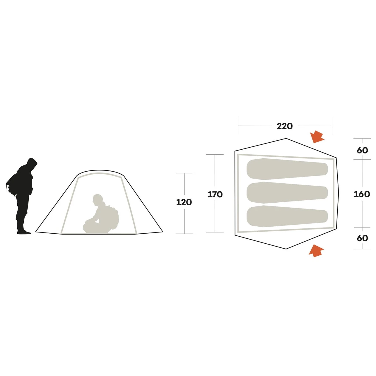 La tienda está diseñada como un refugio para cuatro estaciones para 3 personas, capaz de soportar fuertes vientos, lluvia y carga de nieve. Gracias a las cinco varillas de duraluminio (de aleación resistente 7001 T6), presume de una alta estabilidad incluso en condiciones extremas. Las varillas se cruzan en varios puntos y forman una estructura autoportante que se puede montar fácilmente incluso con mal tiempo o en la oscuridad.