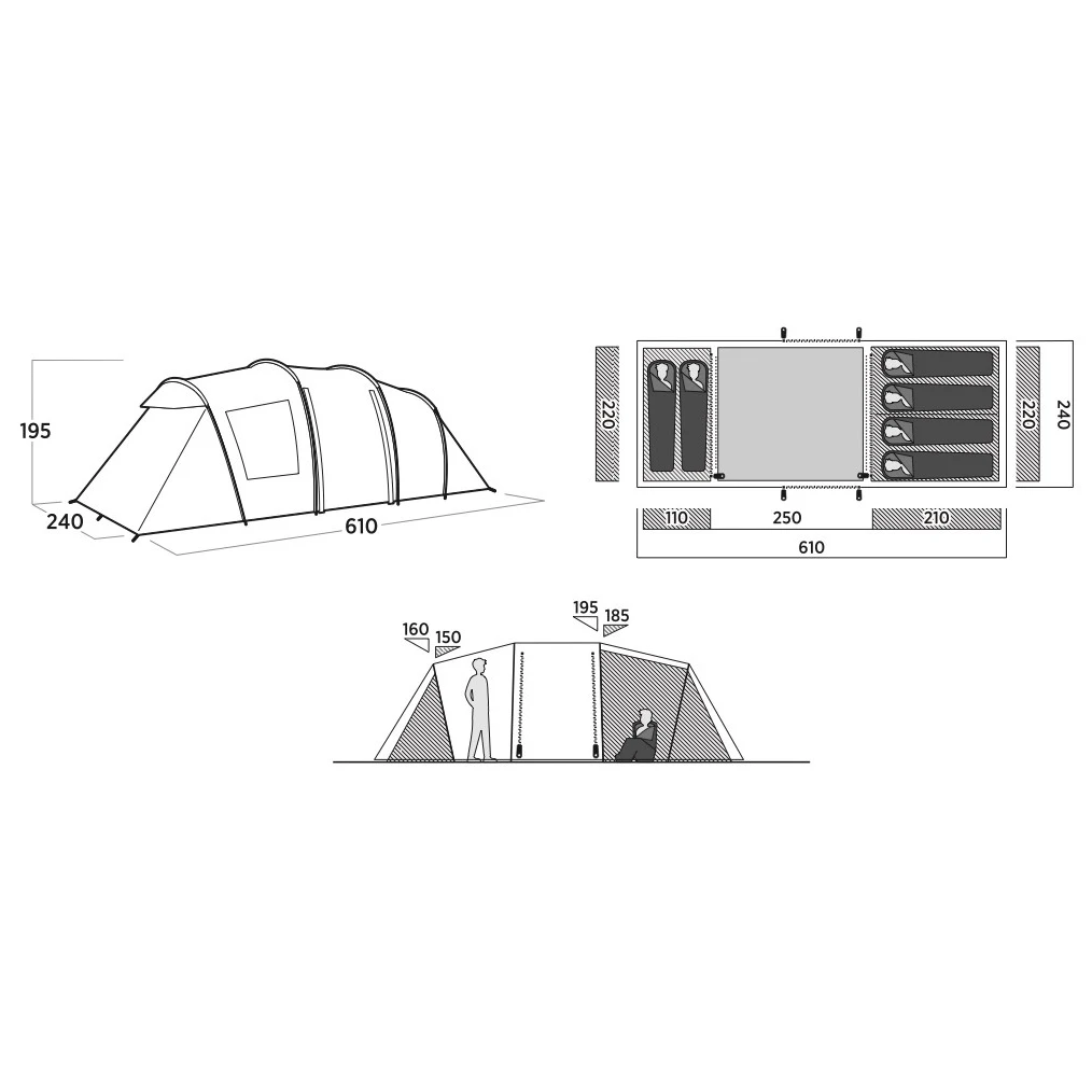 La tienda tiene un gran vestíbulo en el centro con suelo desmontable, dos entradas opuestas con mosquiteras y dos ventanas, lo que ofrece espacio para guardar las pertenencias y para el funcionamiento normal. La altura suficiente de la zona de estar permite moverse en posición vertical. Las ventanas pueden cerrarse con cortinas si es necesario para mayor intimidad. En el interior, encontrará dos dormitorios SleepTight con oscurecimiento para garantizar un sueño tranquilo durante el día. El dormitorio más grande puede dividirse en dos partes con la ayuda de una cortina para mayor intimidad.