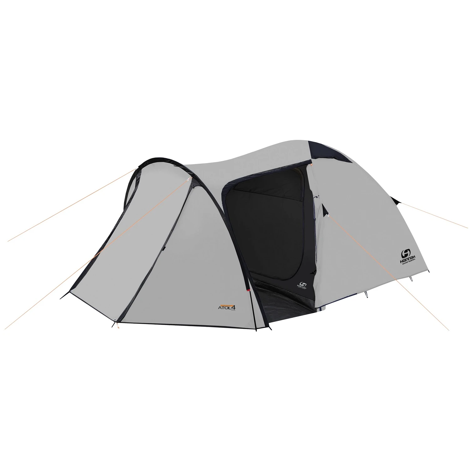Tienda de campaña Atol 4 Cool de la marca Hannah está, por su reducido peso de 6,6 kg y sus pequeñas dimensiones plegadas de 20x50 cm, destinada a los amantes de los paseos de camping en camping o a los navegantes. . Tiene un gran vestíbulo con entrada frontal y lateral, 2 salidas de aire, 1 dormitorio oscurecido (Cool Room) para 4 personas, vestíbulo espacioso, suelo integrado en el vestíbulo. 2 bolsillos y un estante en el techo sirven para guardar objetos pequeños. La estructura de soporte está hecha de varillas de fibra de vidrio, por lo que su construcción es cuestión de minutos.