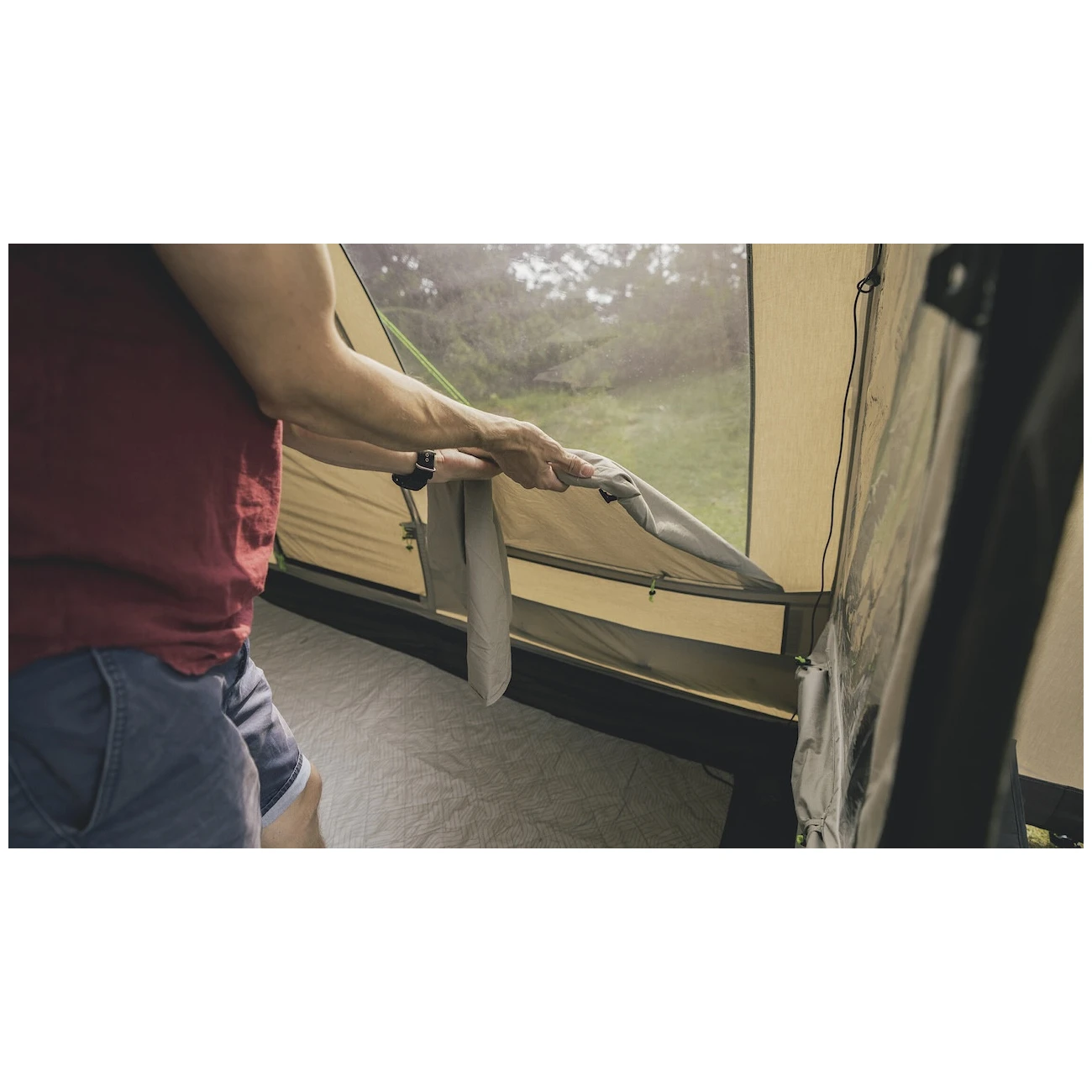 La tienda también cuenta con un sofisticado sistema de ventilación, en el que la parte trasera de la tienda tiene un orificio de ventilación que se puede cerrar con una mosquitera, lo que permite que el aire fluya por la tienda cuando se abren la puerta o las ventanas. También cuenta con bolsillos de almacenamiento, tomas cubiertas para cables de extensión que permiten enchufar una lámpara o cargar el móvil. También apreciará el sistema Hooktrack, al que puede fijar elementos ligeros, cables y lámparas en "raíles" previamente preparados.