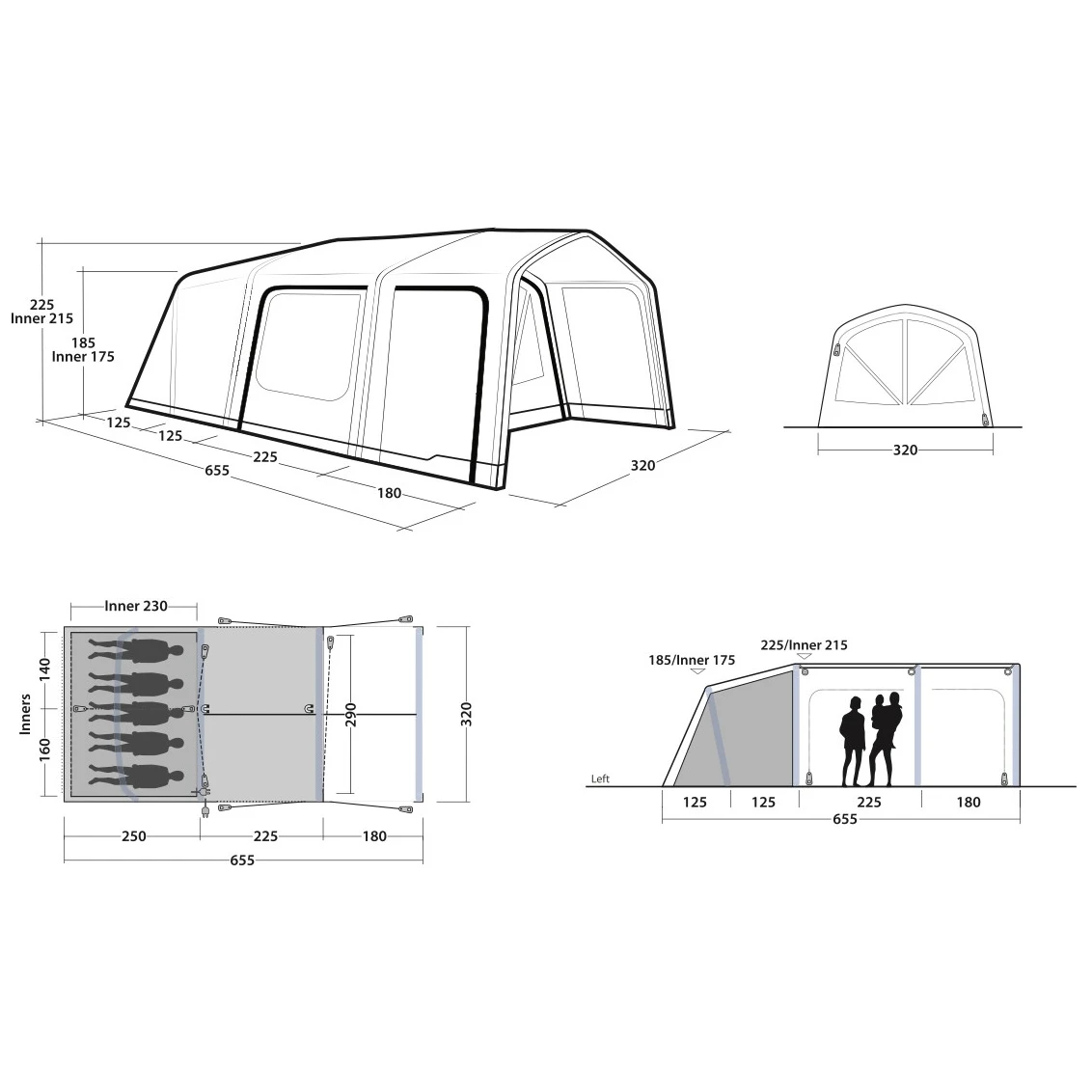 Iowa 5 Air es una tienda de campaña familiar inflable de la colección Premium Air de la marca danesa Outwell, que ofrece alojamiento para 5 personas en dos dormitorios, un vestíbulo espacioso y un toldo.