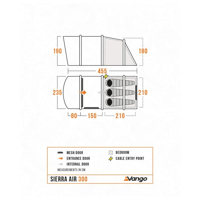 La tienda de campaña Vango Sierra Air 300 es una opción ideal para acampar cómodamente para grupos pequeños o parejas que buscan espacio y una instalación sencilla de la tienda de campaña. Gracias a la tecnología AirBeam®, la construcción de la tienda es rápida y sin esfuerzo.