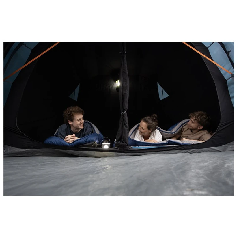 La tienda se monta con varillas de fibra de vidrio PowerFlex®, que son resistentes y muy duraderas. El espacio interior consta de dos dormitorios, separados entre sí y fabricados con tejido Nightfall, que ayuda a bloquear la luz del día y garantiza un sueño de calidad. La amplia zona de estar en el centro es ideal para colocar muebles de camping o una mesa. También hay un sistema Drop Down Door Step, una puerta plegable que facilita la entrada con un cochecito o una silla de ruedas.