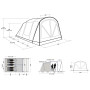 La tienda también cuenta con un sofisticado sistema de ventilación, en el que la parte trasera de la tienda tiene un orificio de ventilación que se puede cerrar con una mosquitera, lo que permite que el aire fluya por la tienda cuando se abren la puerta o las ventanas. También cuenta con bolsillos de almacenamiento, tomas cubiertas para cables de extensión que permiten enchufar una lámpara o cargar el móvil. También apreciará el sistema Hooktrack, al que puede fijar elementos ligeros, cables y lámparas en "raíles" previamente preparados. El sistema patentado Nightlight System está preparado para la iluminación integrada dentro y fuera de la tienda.