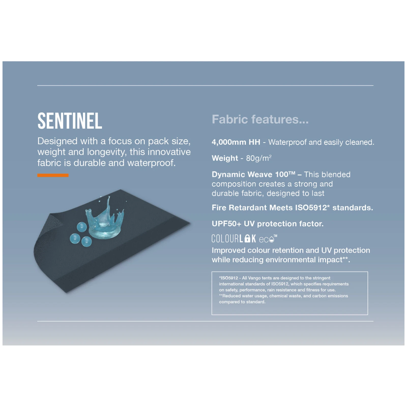 El toldo lateral Sentinel Side Awning del fabricante Vango está hecho de tejido duradero Dynamic Weave 100™ con una columna de agua de 4000 mm HH, que destaca por su excelente relación entre resistencia, peso y dimensiones compactas cuando está plegado. Gracias a la tecnología ColourLok, el material conserva su color y propiedades funcionales a largo plazo. La estructura está formada por varillas de fibra de vidrio PowerFlex®, que son ligeras, resistentes y fiables incluso en condiciones de viento.