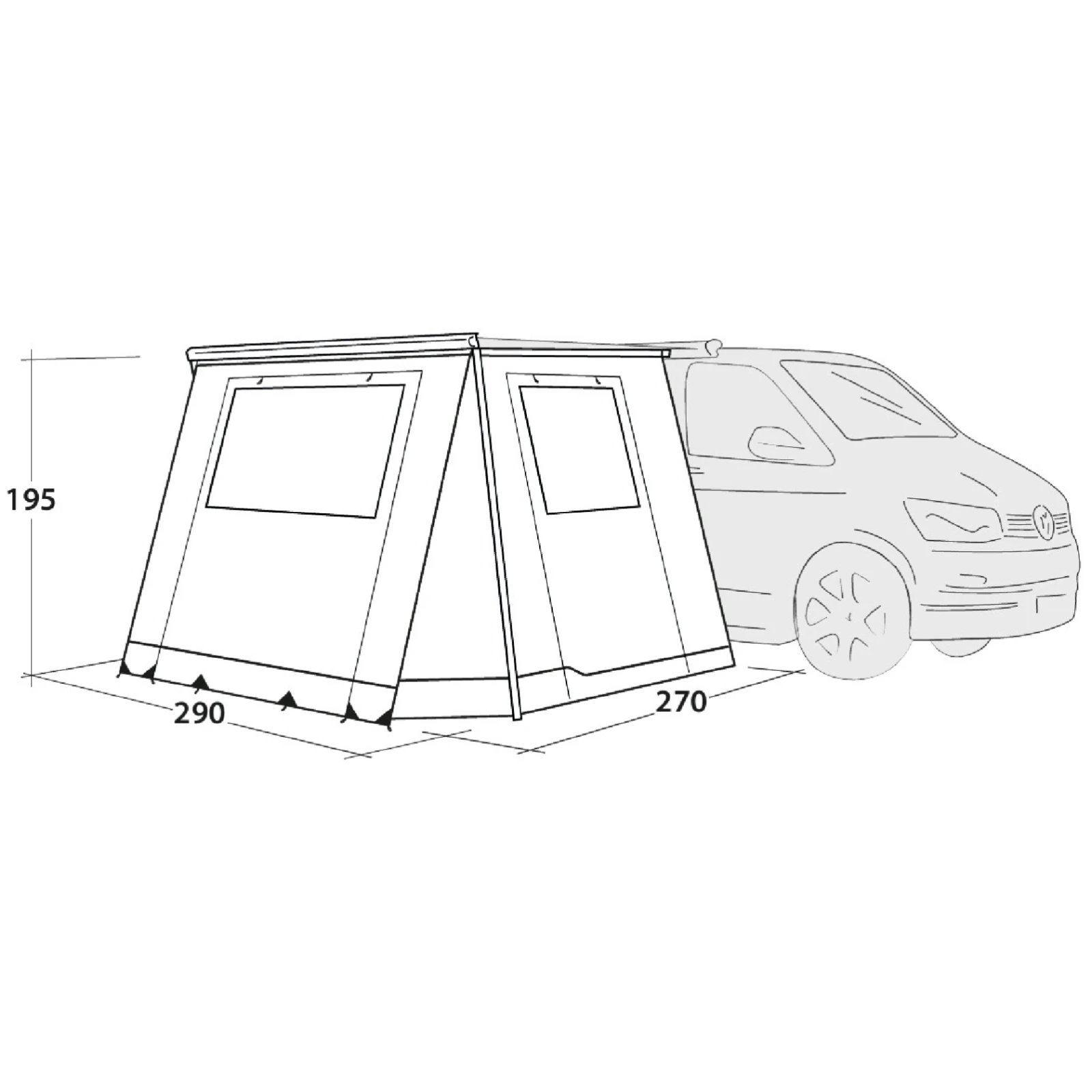 Adecuado para toldos de 260/270x200 cm: Thule 5200, Thule 5102, Thule Sidehill, Fiamma F43 Van, Fiamma F45s, Fiamma F45 VW T5/T6, Fiamma F45 PSA, Dometic PW1100 y Dometic PW1500. Ideal para autocaravanas tipo VW T5/T6/T6.1 (Multivan, Caravelle, Transporter, California), MB W639/W447 (Clase V, Vito, Marco Polo) etc.