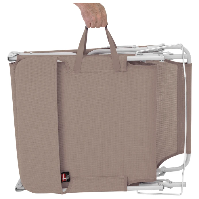 La estructura de la tumbona está hecha de acero resistente con recubrimiento en polvo, complementada con una agradable tela de punto de 100% poliéster, fácil de limpiar y mantener. La tumbona también cuenta con un reposapiés ajustable, que se puede configurar en 3 posiciones diferentes. Esto le permite elegir el ángulo ideal para sus necesidades. Las dimensiones compactas garantizan un fácil almacenamiento tras el plegado. El transporte se facilita además con un asa integrada.