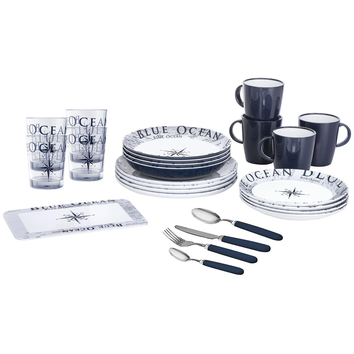 All Inclusive Blue Ocean de la marca Brunner es un juego de vajilla de 36 piezas altamente duradero y elegante que contiene todo lo necesario para una experiencia de camping perfecta.