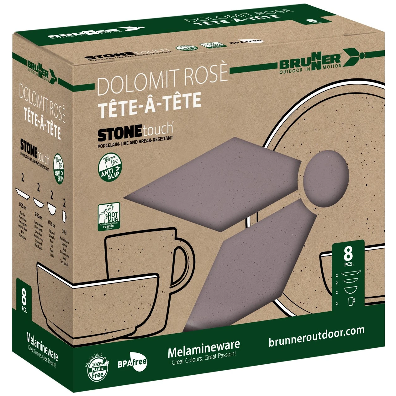 El juego de vajilla Dolomit Set tete-a-tete de la marca Brunner contiene equipo básico para acampar. El juego consta de 8 piezas y es adecuado para 2 personas. En el camping apreciará la mayor durabilidad gracias a la melamina. Este material es resistente a los golpes, fácil de limpiar, resistente al calor y la humedad, inodoro e insípido, y respetuoso con el medio ambiente. La vajilla se puede meter en el congelador y en el lavavajillas.