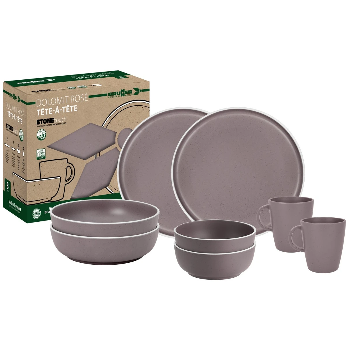 El Dolomite Set tete-a-tete de la marca Brunner es un juego de vajilla muy duradero y elegante que está equipado con un anillo antideslizante en la parte inferior.