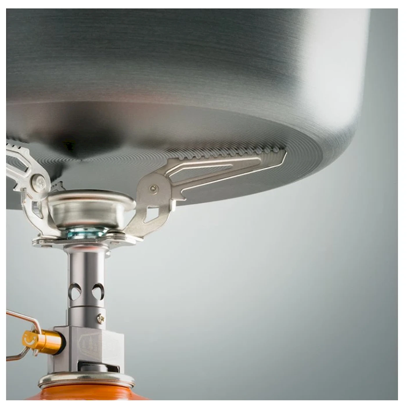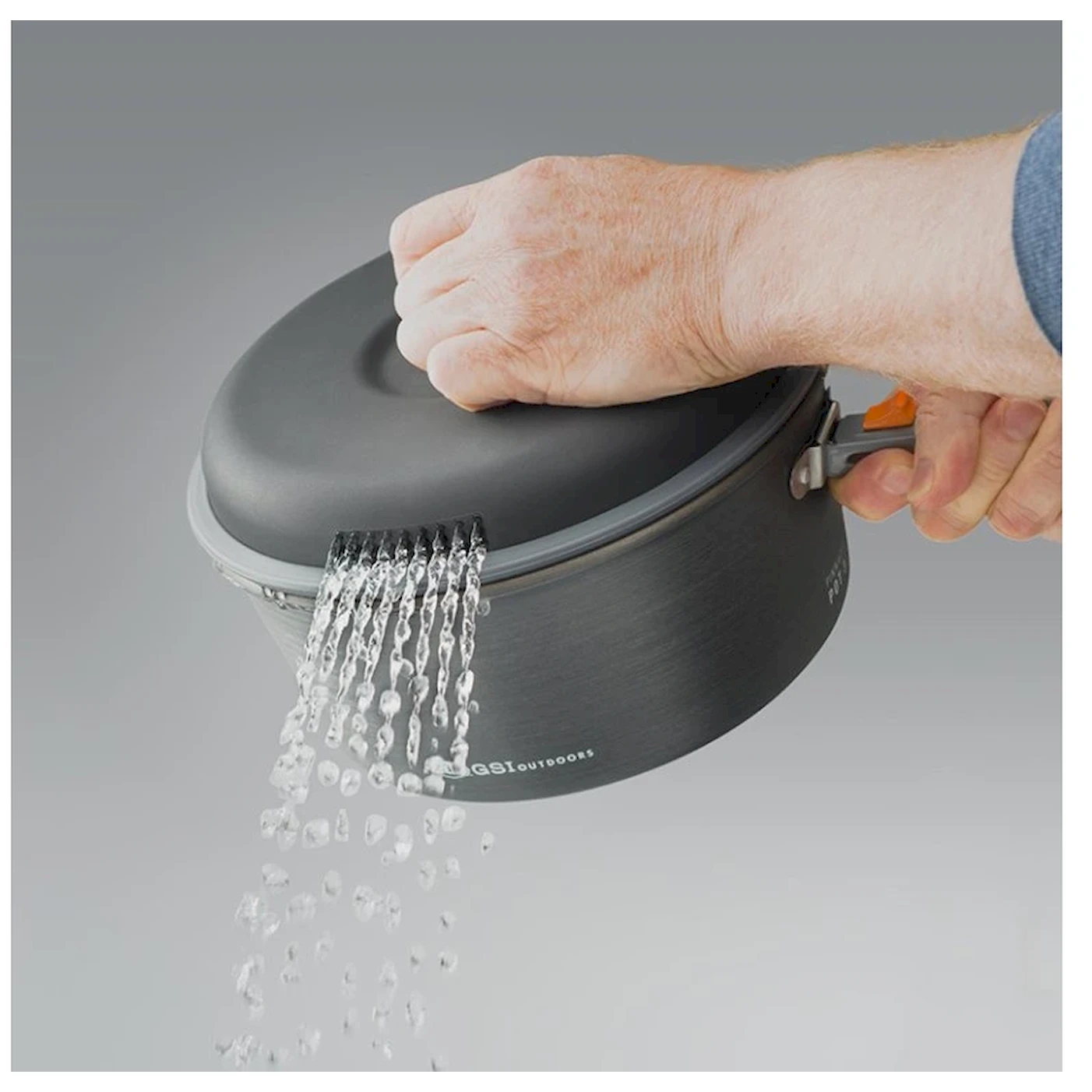 La batería de cocina está fabricada con aluminio anodizado duro con un revestimiento cerámico que garantiza una transferencia de calor uniforme y una fácil limpieza. La olla principal de 5 litros cuenta con robustas asas plegables con bloqueo que facilitan su manipulación y el vertido. Su diseño compacto permite guardar fácilmente todos los componentes en la resistente bolsa incluida.
