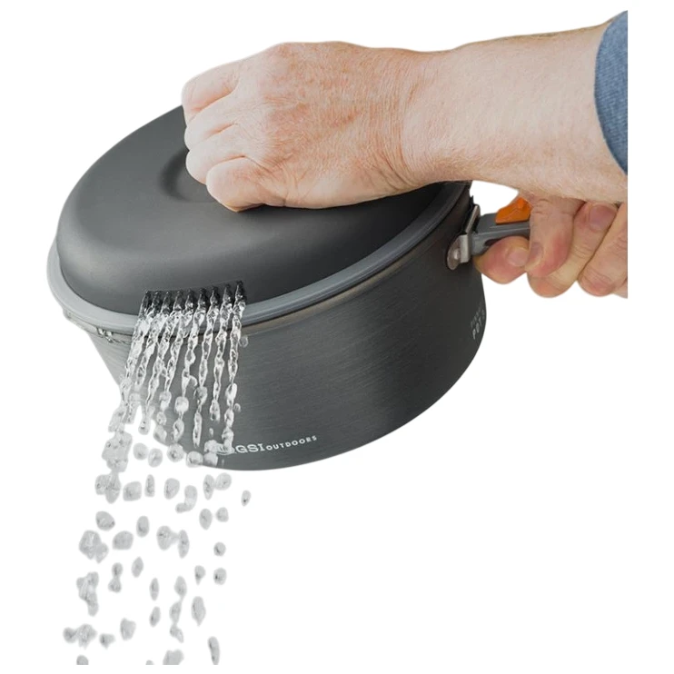 La vajilla está hecha de aluminio anodizado duro con un revestimiento cerámico antiadherente para cocinar cómodamente y facilitar la limpieza. El diseño compacto permite guardar todo el equipo en una bolsa sólida que también sirve como fregadero o lavabo. El soporte plegable para ollas se fija de forma segura desde el exterior para evitar que se raye la superficie de la vajilla.