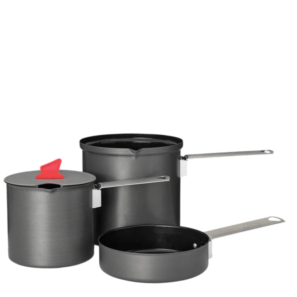Primus Trek Pot es un juego de utensilios de cocina compacto para cocinar al aire libre y en el camping. Dos ollas, una sartén y tres asas se pueden apilar juntas, lo que ahorra espacio durante el transporte.