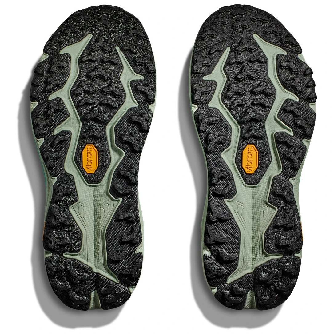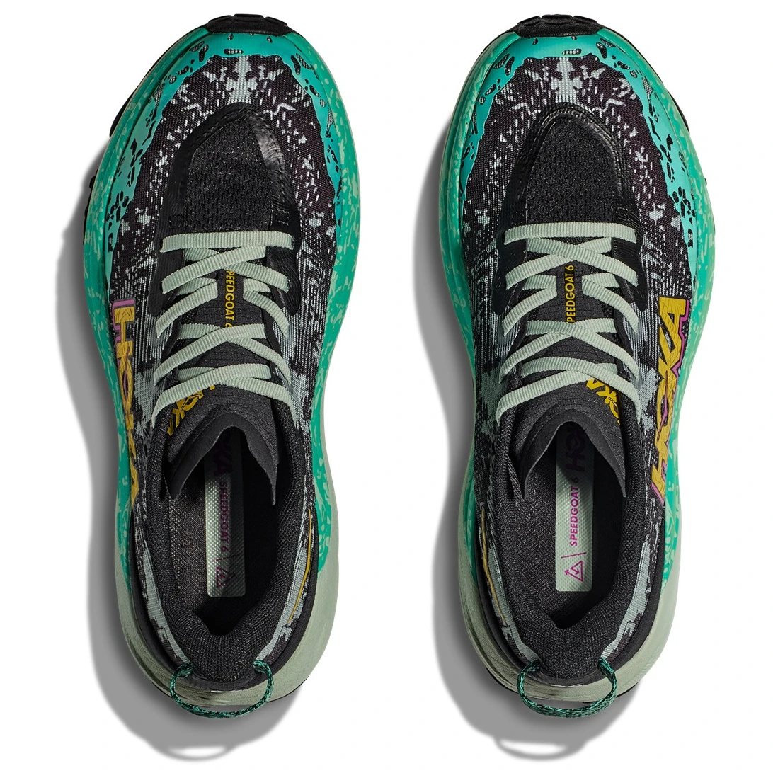 Zapatilla para correr Speedgoat 6 de la marca Hoka está diseñada para senderos técnicos. La sexta generación regresa con un peso reducido y una gran tracción. Esta zapatilla continúa desde la suela hasta los cordones con una entresuela Vibram® Megagrip y un taco de tracción para mejorar el agarre en terrenos sueltos. La Speedgoat 6 mantiene la misma altura de suela y forma de balancín (curvatura de la suela exterior), utiliza un compuesto de entresuela más ligero y una malla jacquard de dos capas más gruesa que inspira confianza en cualquier terreno.